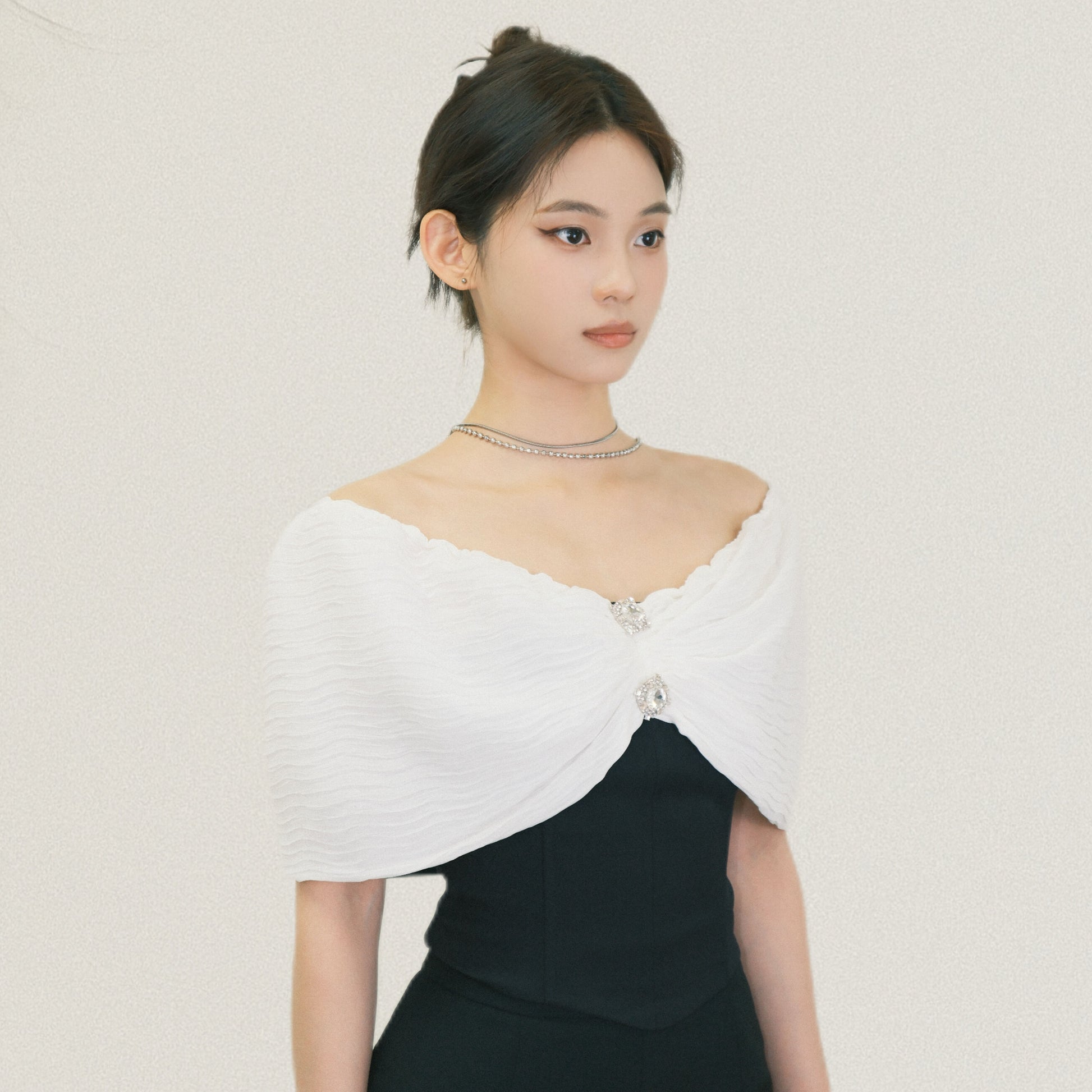 A sculptural off-shoulder top that redefines modern femininity. Crafted from a delicately textured white fabric, it drapes elegantly across the shoulders and gathers at the front with a crystal embellishment, creating a soft yet structured silhouette.
